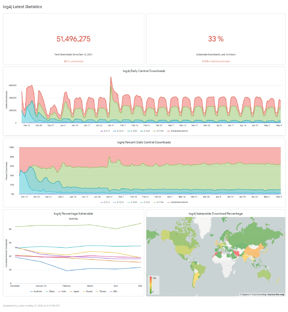根据 sonatype 的统计数据,在 Maven Central 上,每个工作日易受攻击的 Log4j 版本仍然有超过 100,000 次的下载量。