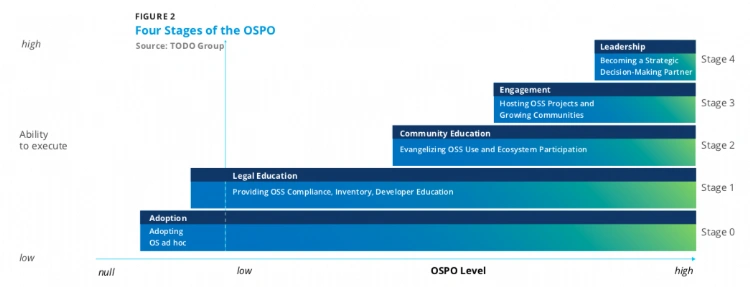2022 年 2 月,TODO 工作组发布的 OSPO 报告里提出了 “OSPO 成熟的 5 个阶段”: