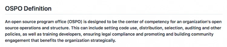 因此,企业内部针对开源成立专门的组织机构几乎是命中注定。Open Source Program Office(简称 OSPO),也就是我们所说的 “开源办公室”,就是这样的背景下诞生的。