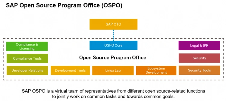 其中的经典例子就是 SAP,SAP 在 2018 年初成立了自己的 OSPO,将其开源项目办公室组建为一个虚拟团队,由来自不同领域的多个团队组成董事会。